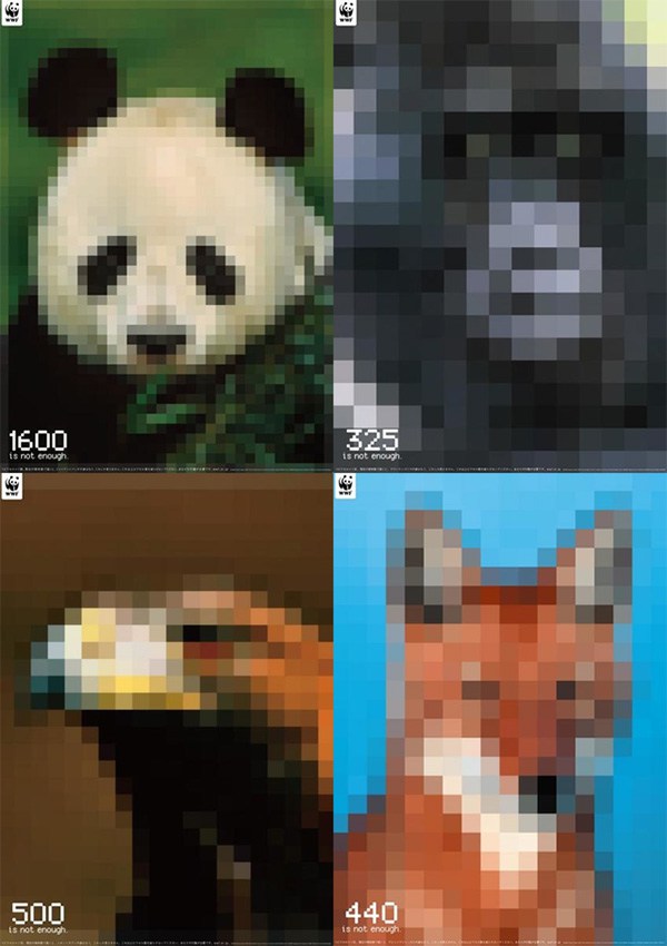 Si bien no se trata de simples retratos estas imágenes realizadas por el artista Mikami Yoshiyuki para la World Wildlife Fund busca representar el número de animales restantes en el mundo (de algunas especies) con Pixeles.