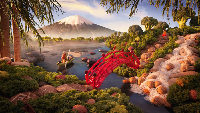 El artista señala que lo ha realizado uniendo fotografías a una por una de diversos ingredientes antes de que se descompongan por lo que estos paisajes tienen una gran cantidad de horas de trabajo que los respaldan; sin más, te dejo con los mundos comestibles de Carl Warner.