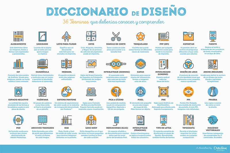Hace unos años se compartió en CreativeMarket un diccionario de diseño con 36 términos que eran señalados como indispensables para todos los diseñadores gráficos.
