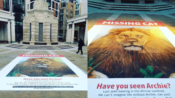 Pero, ¿Porque se desvanece?; como parte de la campaña este cartel se desvanecía con el pasar de los zapatos de los transeúntes, lo anterior con intención de mostrar la huella que dejan los hombres en el camino a la extinción a la que se encuentran empujadas miles de especies como “Archie el León“.