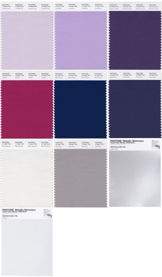 Stroke of Midnight – consta de tonos “después de la oscuridad” que representan la poderosa energía y la magia entre los recién casados. La paleta está marcada por románticos azules crepusculares y violetas rojizos, y una selección de blancos centelleantes ayuda a dar un “brillo incandescente“.